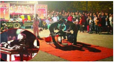 4月7日晚8点左右,扬州市五里庙派出所民警巡逻至广陵区观潮路古运新苑小区附近时,看到该小区门口停着一辆演出车,一名男子站在车前,正在表演,不少群众驻足观看,不时有人发出惊叫声。